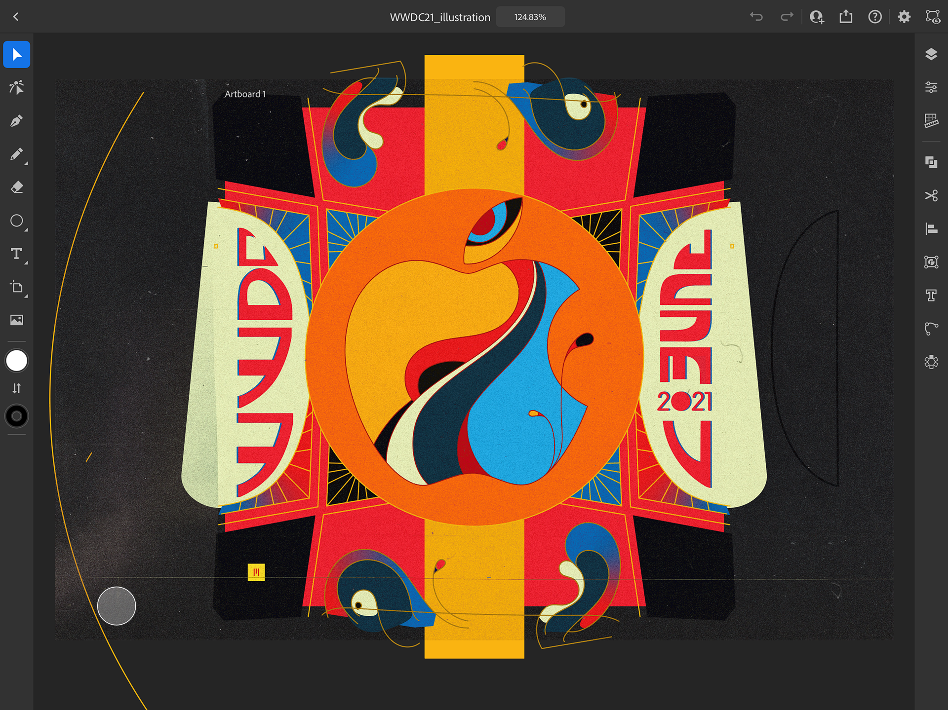 Illustration inspired by the upcoming Apple all online-event, WWDC21 on June 7th. Using illustrator on the iPad Pro, I wanted to challenge myself by experimenting with it and also creating a custom typeface using shapes, pen tool and the shape builder.
